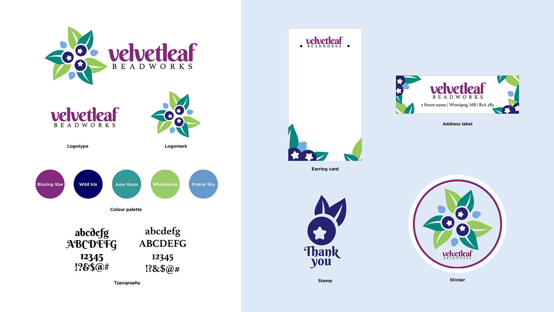 A local Métis artisan was interested in creating a visual identity for her beadwork business. She was unsure of what name or direction she wanted to take, so I went through her story and family history to see if we could find a starting point. Picking wild velvetleaf blueberries as a child was a special memory for her, so I chose the name Velvetleaf Beadworks.